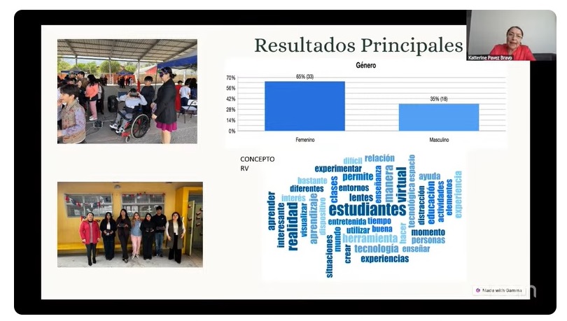 En su presentación, Katherine exploró cómo la IA y la Realidad Virtual pueden actuar como motor de innovación pedagógica, enfatizando el diseño de entornos virtuales que potencian la participación, la personalización y el aprendizaje activo. Su intervención subrayó la importancia de integrar la IA como herramienta didáctica, pero también como objeto crítico de estudio.
