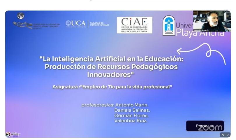 Luego del Webinar IA en el aula: experiencias, aprendizajes y evidencias emergentes, el 3 de diciembre de 2025, se realizó el segundo y último encuentro del Ciclo de Webinars: Innovaciones en el aula con Inteligencia Artificial, una iniciativa conjunta entre el Centro de Investigación del Impacto Social y Político de la IA de la Facultad de Ciencias Sociales de la UCA, el Centro de Investigación Avanzada en Educación (CIAE) de la Universidad de Chile y la Universidad de Playa Ancha (UPLA). El Ciclo de Webinars se enmarca en la Convocatoria 2025 “Innovaciones en el Aula con IA”, y posterior “Encuentro Internacional de Innovaciones en el Aula con Inteligencia Artificial, realizado el pasado 7 de mayo de 2025”